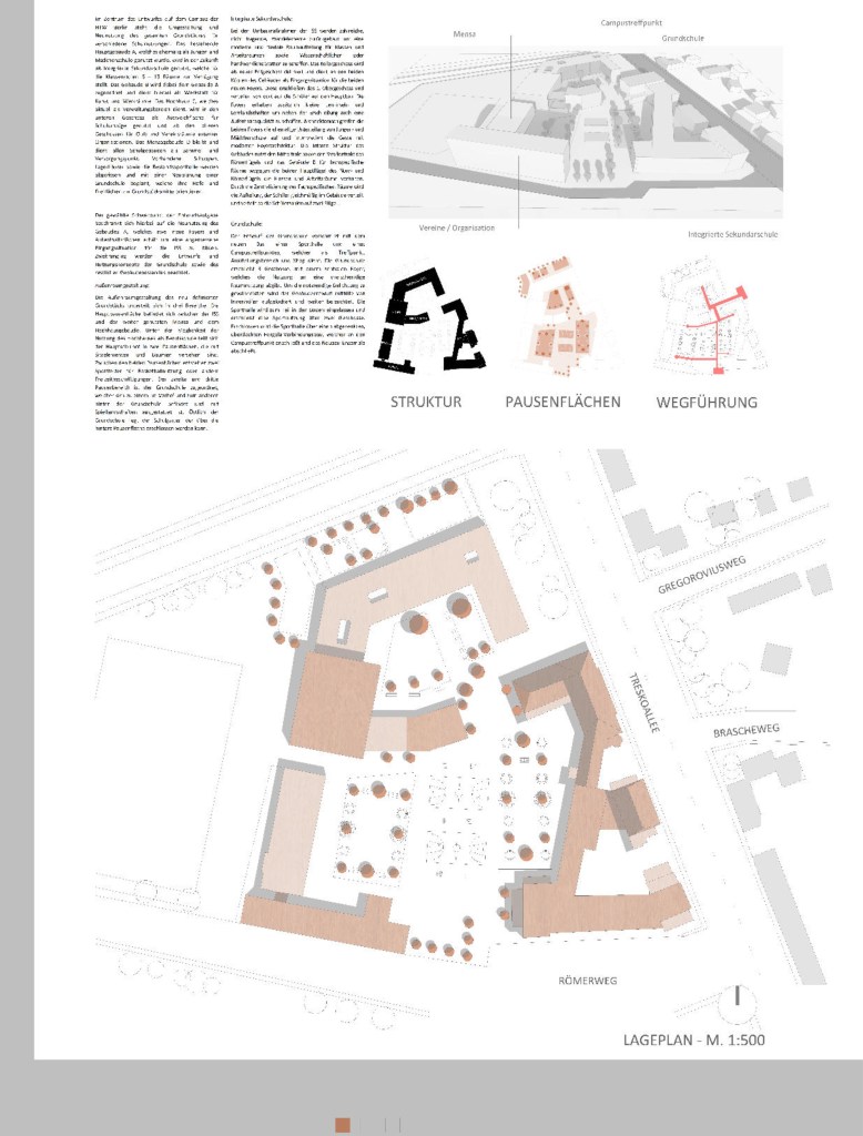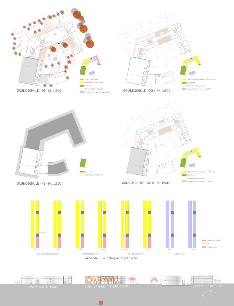 Im Zentrum des Entwurfes auf dem Campus einer ehemaligen Universität steht die Umgestaltung und Neunutzung des gesamten Grundstückes für verschiedene Schulnutzungen. Das bestehende Hauptgebäude A, welches ehemalig als Jungen- und Mädchenschule genutzt wurde, wird in der Zukunft als Integrierte Sekundarschule genutzt, welche für die Klassenstufen 6 – 13 Räume zur Verfügung stellt. Das Gebäude B wird dabei dem Gebäude A zugeordnet und dient hierbei als Werkstatt für Kunst und Werkräume. Das Hochhaus C, welches aktuell als Verwaltungsbereich dient, wird in dem unteren Geschoss als Ausweichfläche für Schulumzüge genutzt und ab den oberen Geschossen für Club- und Vereinsräume externer Organisationen. Das Mensagebäude D bleibt und dient allen Schulgebäuden als Sammel- und Versorgungspunkt. Vorhandene Schuppen, Lagerhäuser sowie die Bestandssporthalle werden abgerissen und mit einer Neuplanung einer Grundschule beplant, welche ihre Höfe und Freiflächen zur Grundstücksmitte orientieren.