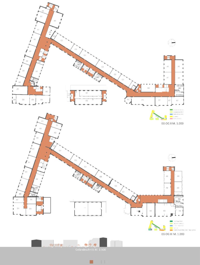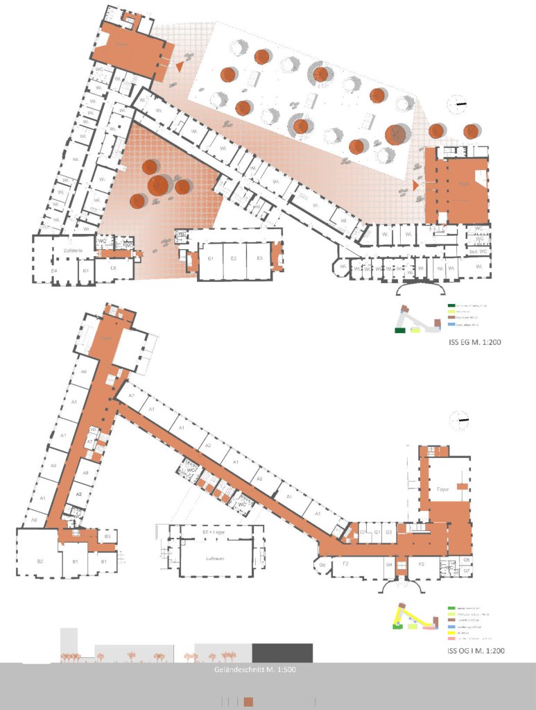 Der gewählte Schwerpunkt der Entwurfsaufgabe beschränkt sich hierbei auf die Neunutzung des Gebäudes A, welches zwei neue Foyers und Aufenthaltsflächen erhält um eine angemessene Eingangssituation für die ISS zu bilden. Zweitrangig werden die Entwürfe und Nutzungskonzepte der Grundschule sowie des restlichen Gebäudebestandes beachtet.