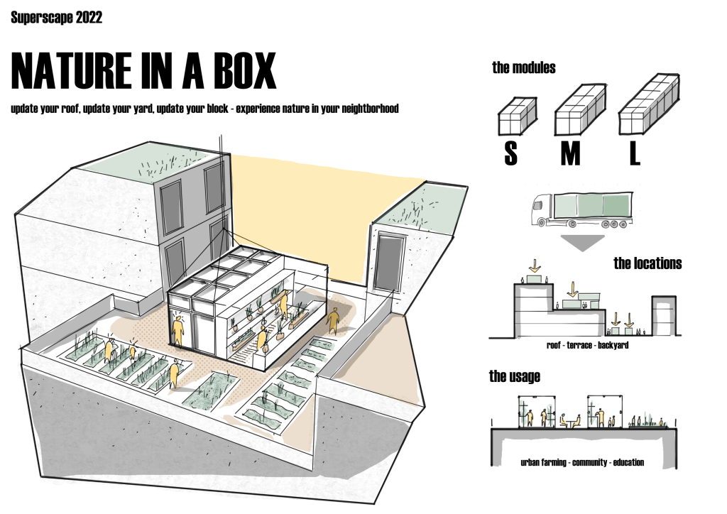 Die Nutzung des Gewächshauses dient in erster Linie der Auseinandersetzung mit Natur und dem Urban Farming. Je nach Größe werden kleine oder große Fläche zur Verfügung gestellt und ermöglichen eine Anpassung auf die örtlichen Interessierten und Flächenreserven. Zusätzlich zur reinen Auseinandersetzung mit der Natur wird das Gewächshaus zu einem Punkt der Gemeinschaft. Sie ermöglicht die Erweiterung durch Dachflächenpflanzen, kann als Umweltbildung von Kindern und Jugendlichen dienen oder als abendlicher Gemeinschaftsort verstanden werden. Das Gewächshaus bleibt somit nicht nur ein einfache Erweiterung, sondern besitzt das Potenzial sich zum Herzen einer Wohneinheit zu entwickeln.
