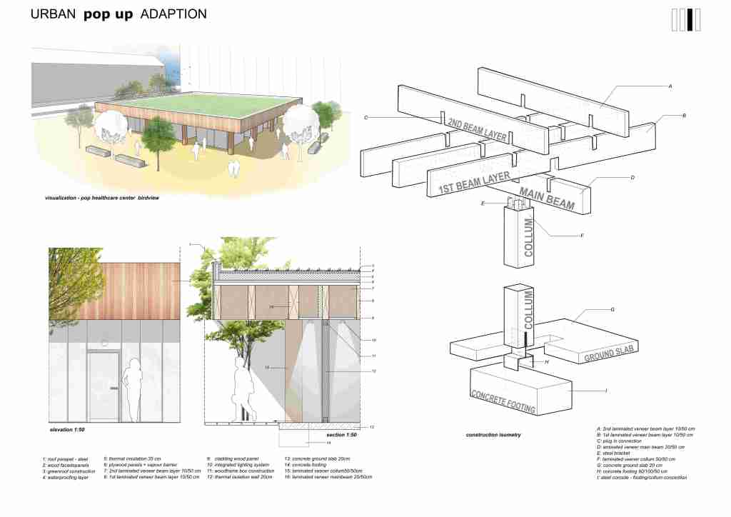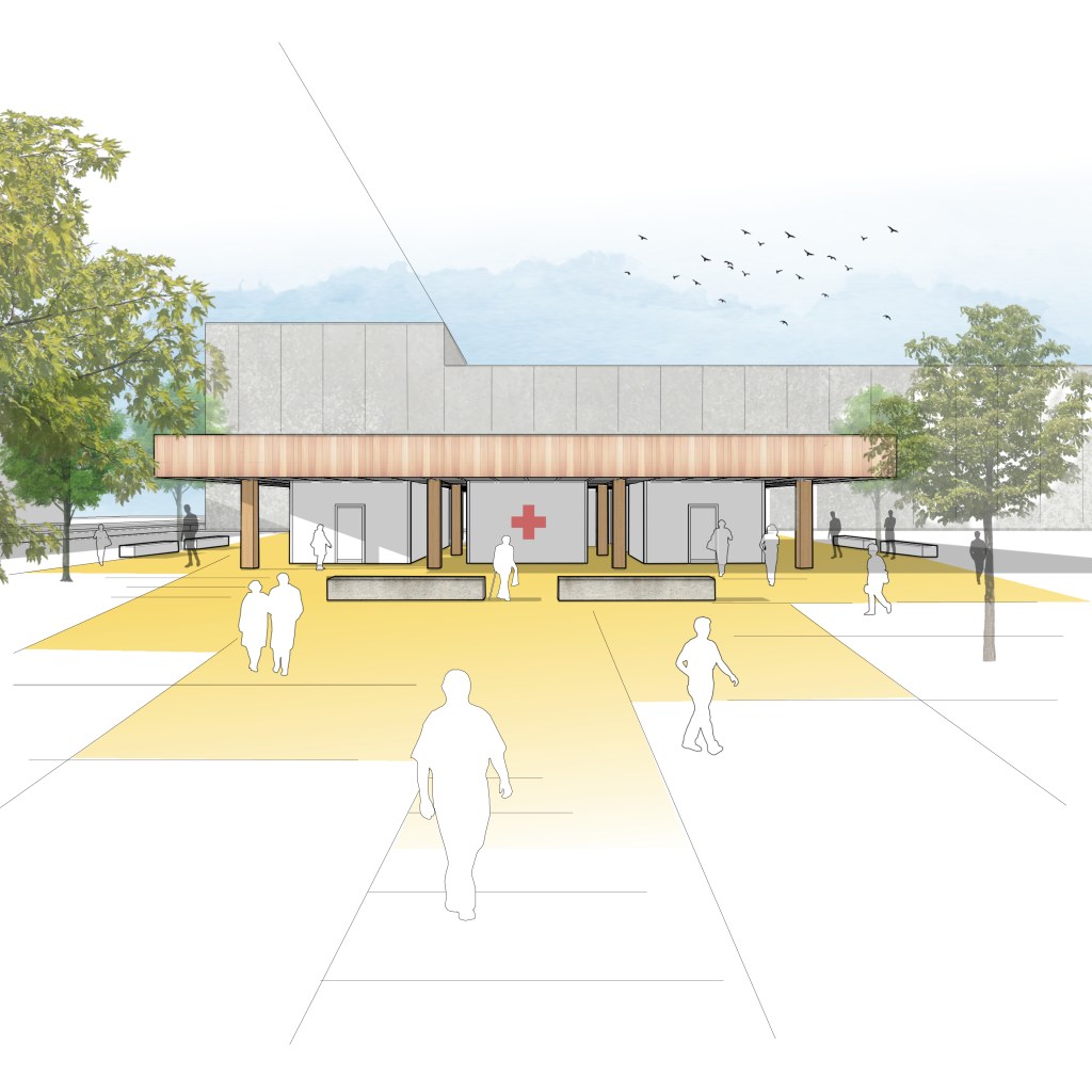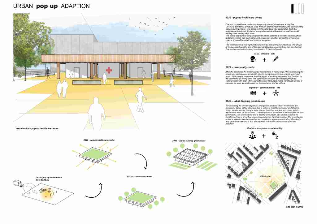 The pop up healthcare center is a temporary place for treatment during the COVID19-pandemic. Because of its modular skeleton construction, the basic building can be divided into several boxes, where patients can be vaccinated, tested or material can be stored. In doctor’s surgeries people often need to wait in a small waiting room next to each other.