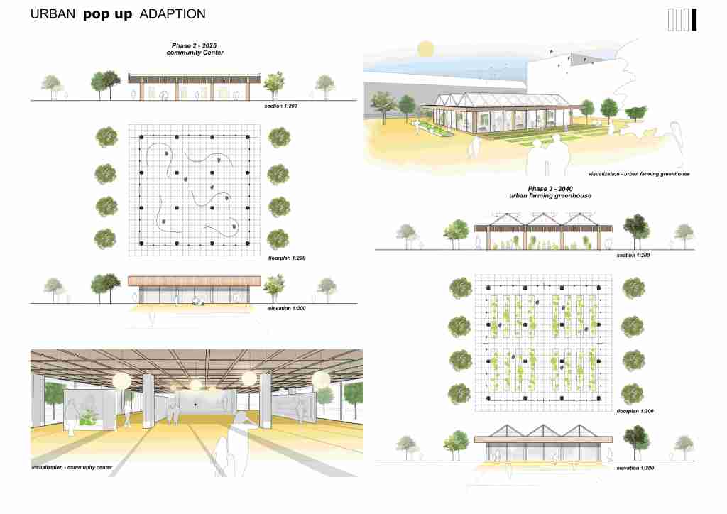 For achieving the climate objectives changes in all areas of our modern life are necessary. Cities will be changed due to different mobility behaviour and lifestyle. Urban structures may become even denser than they are now and green hearts within cities must be established. The last phase of the center is a message for future generations, for sustainability and a healthy ecosystem. The center can now be transformed into a greenhouse providing an urban farming location. The greenhouse is also a place for coming together and relaxing in a green surrounding. Residents may grow their own crops and teach others how to live more sustainable and healthier.